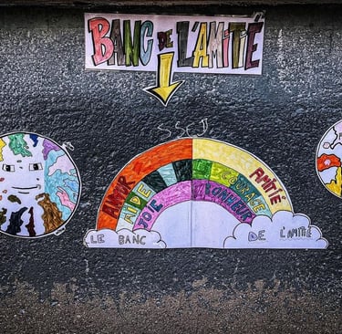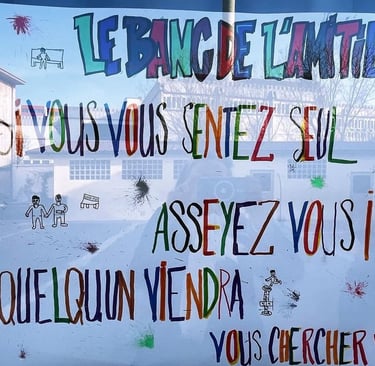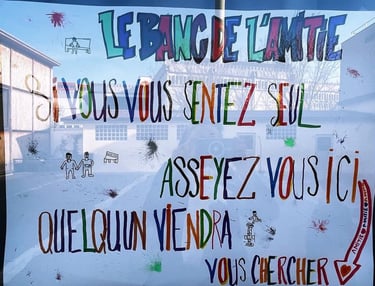 Le banc de l’amitié est un concept simple mais puissant : un endroit où chaque élève peut s’asseoir lorsqu’il souhaite faire de nouvelles rencontres ou discuter avec d’autres camarades. Cet espace symbolise l’inclusion et la convivialité, en encourageant les élèves à se soutenir et à s’intégrer dans la vie collective de l’établissement.